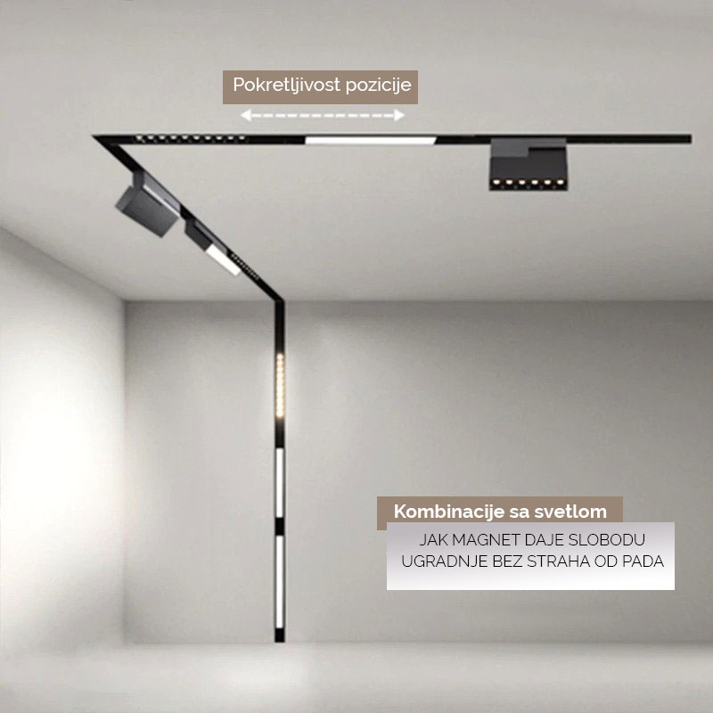 Magnetic šinska rasveta koja budi kreativnost u vama i igru sa svetlošću. Savršeno je primenjiva i adaptilna za različite potrebe i prilike. Odličan izbor, kako za projektnu i profesionalnu rasvetu, tako i za kućnu upotrebu za korisnike sa prefinjenim ukusom. Magnetic šinska rasveta dozvoljava kreativnost i uklapanje u svakom prostoru. Precizan i fleksibilan sistem šinske rasvete se prilagođava i menja prema želji korisnika i zahtevima projekta. Elementi su izrađeni od ekstrudiranog aluminijuma, lagane su konstrukcije i vrlo jednostavno se premeštaju i postavljaju na željena mesta bez upotrebe posebnog alata. Svetlosni izvori su dostupni u raznim veličinama i snazi, a uz pomoć konektora i uglova Magnetic šinsku rasvetu možete postavljati i na plafone i na zidove.